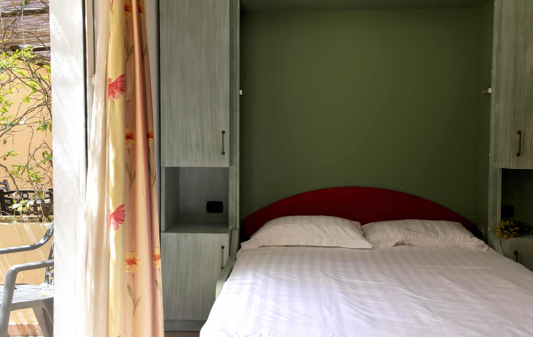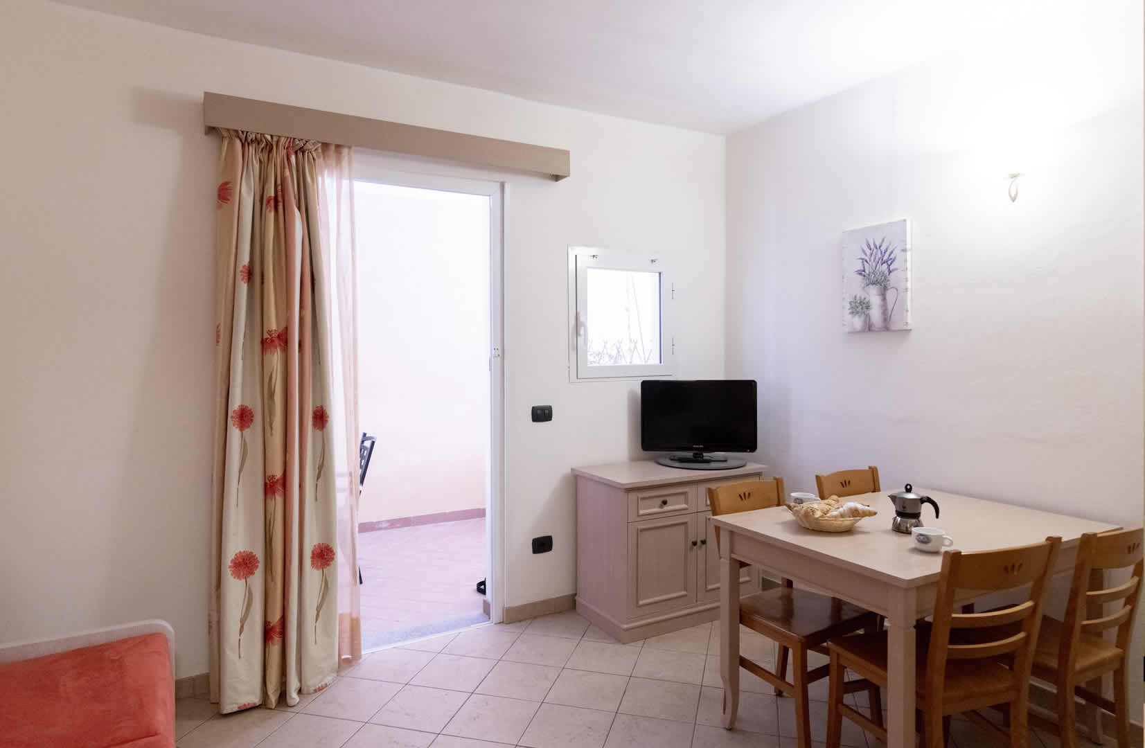 L'appartement de deux pièces de type D comprend une chambre à coucher, un salon spacieux avec un canapé-lit double et une kitchenette équipée, un lit superposé dans le couloir, une salle de bains avec douche et une terrasse ou un patio meublé. Idéal pour les familles jusqu'à 6 personnes (5 adultes et 1 enfant).